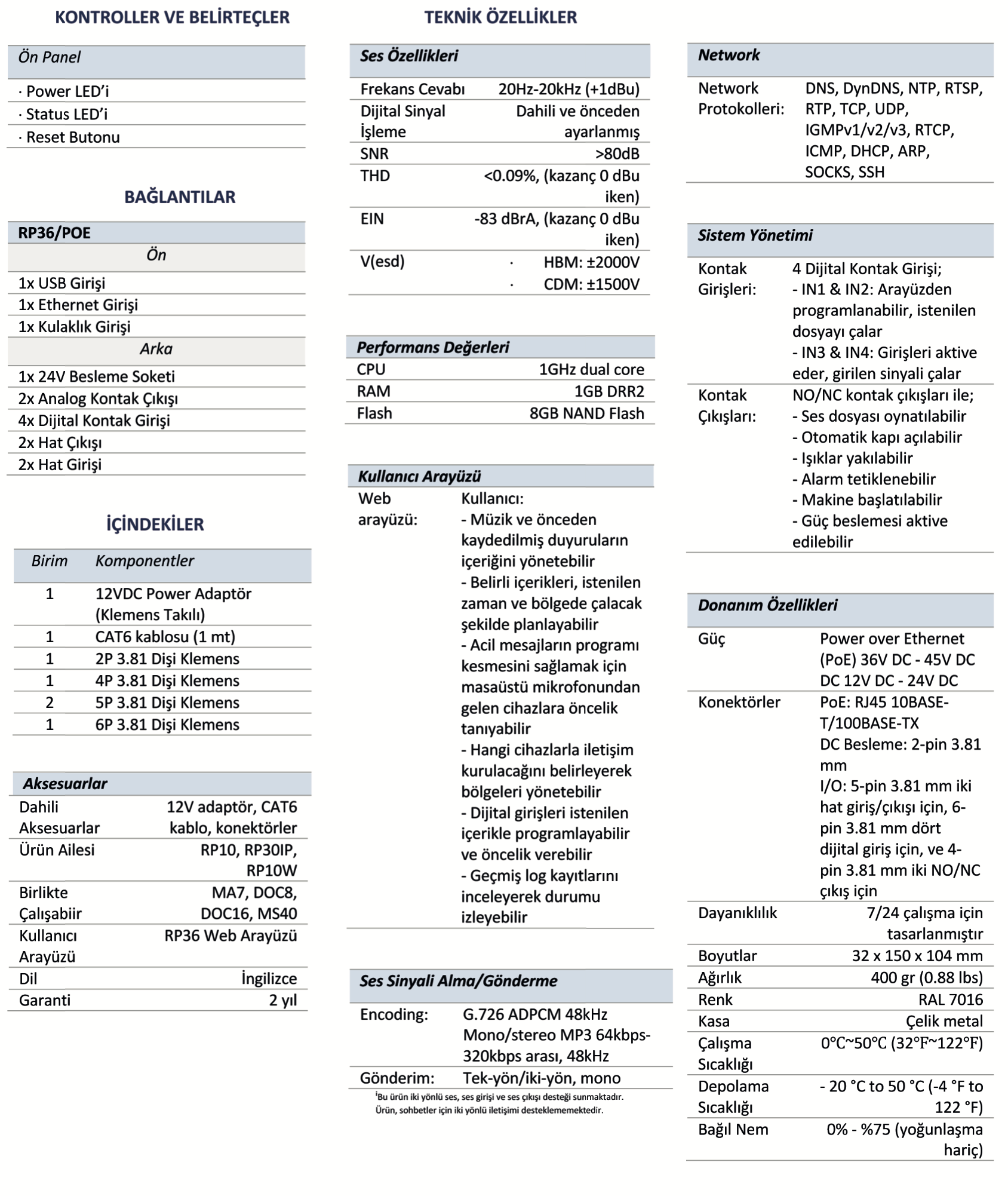 RP36, ESCO Serisi Network Tabanlı Seslendirme ve Anons Sisteminin birçok donanımsal özelliğe sahip TCP/IP tabanlı audio decoder cihazıdır. G.711/G.722/WAV/MP3 decode edebilir. Network üzerinden (diğer RP-36 cihazları veya MA5 cihazından) gelen stream datalarını, data türüne göre decode ederek çalabilir. Ağ üzerinden gelen yayın mikrofon ve hat girişleri için 48000Hz ve MP3 yayını için 44100Hz olmalıdır.